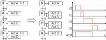 - Action conditionnelle : l'action est exécutée si, en plus de l'activité de l'étape à laquelle elle est associée, une condition logique spécifiée est vraie (voir chronogramme 2 ci-contre). Ces actions conditionnelles sont particulièrement importantes car elles permettent, dans une étape, de réaliser une combinatoire locale en vue, par exemple, d'exécuter l'action seulement pendant un certain temps, ou après un certain temps d'activité de l'étape (voir les chronogrammes 3 et 4 ci-contre).