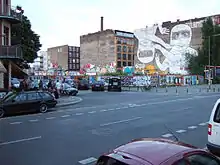 Selon le récit de Henke, le mur noir n'est pas non plus censé être une déclaration d'impuissance, car il a déjà été interprété. Au contraire, c'est une démonstration de la capacité d'agir. Le bon art ou le bon street art se caractérise également par le fait qu'il fonctionne par rapport à une situation et n'est pas simplement illustratif[16]. Le Léviathan, la fresque murale de Blu (également appelée Pink Man, Blu's Backjump Mural), située au bout de la Falckensteinstraße, est toujours présente (en 2015). On marche vers l'incontournable géant rose en quittant l'Oberbaumbrücke en direction de Kreuzberg[17].