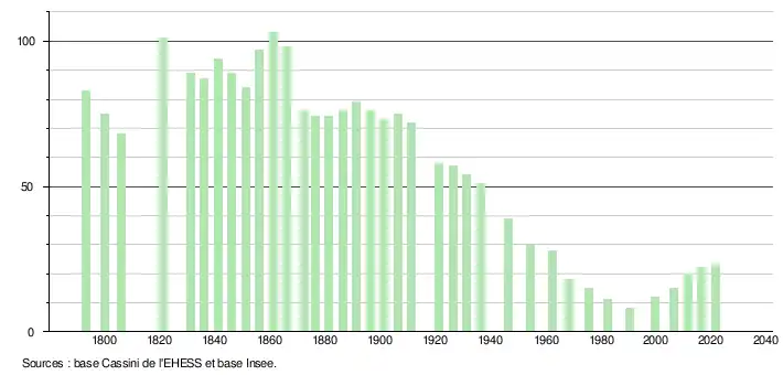 | L'évolution du nombre d'habitants est connue à travers les recensements de la population effectués dans la commune depuis 1793. Pour les communes de moins de 10 000 habitants, une enquête de recensement portant sur toute la population est réalisée tous les cinq ans, les populations légales des années intermédiaires étant quant à elles estimées par interpolation ou extrapolation[39]. Pour la commune, le premier recensement exhaustif entrant dans le cadre du nouveau dispositif a été réalisé en 2006[40]. En 2021, la commune comptait 23 habitants[Note 8], en augmentation de 9,52 % par rapport à 2015 (Hautes-Pyrénées : +1,04 %, France hors Mayotte : +1,84 %). |
