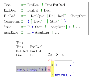 int v ;main(){ " et qui concerne le choix d’une règle pour dériver le non-terminal " Stmt ". En regardant uniquement le premier jeton d'anticipation " v ", il ne peut pas choisir laquelle des deux alternatives pour " Stmt " choisir, étant donné que deux suites d'entrées sont possibles. Ils peuvent être distingués en jetant un coup d'œil sur le deuxième jeton d'anticipation (fond jaune). Un langage qui a une grammaire LL est appelé un langage LL. Ceux-ci forment des sous-ensembles de grammaires déterministes non-contextuelles (DCFG) et de langages déterministes non-contextuels (DCFL), respectivement.