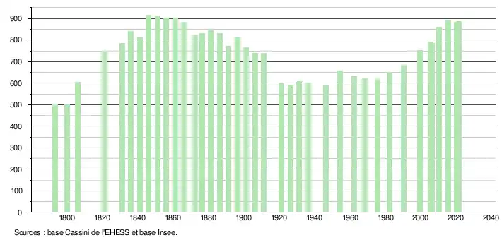 L'évolution du nombre d'habitants est connue à travers les recensements de la population effectués dans la commune depuis 1793. Pour les communes de moins de 10 000 habitants, une enquête de recensement portant sur toute la population est réalisée tous les cinq ans, les populations légales des années intermédiaires étant quant à elles estimées par interpolation ou extrapolation[14]. Pour la commune, le premier recensement exhaustif entrant dans le cadre du nouveau dispositif a été réalisé en 2005[15].