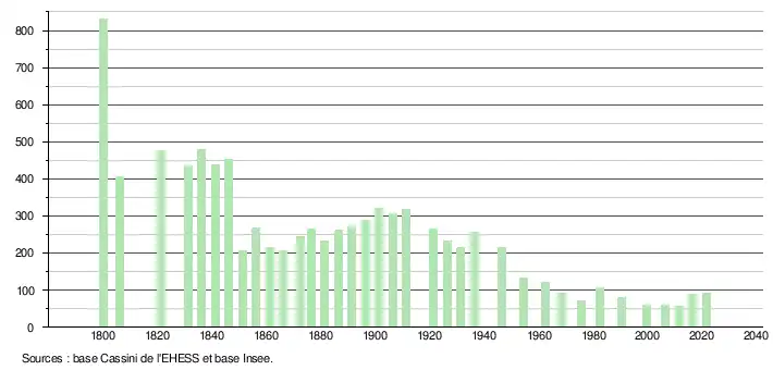 L'évolution du nombre d'habitants est connue à travers les recensements de la population effectués dans la commune depuis 1800. Pour les communes de moins de 10 000 habitants, une enquête de recensement portant sur toute la population est réalisée tous les cinq ans, les populations légales des années intermédiaires étant quant à elles estimées par interpolation ou extrapolation[8]. Pour la commune, le premier recensement exhaustif entrant dans le cadre du nouveau dispositif a été réalisé en 2006[9].