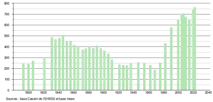 L'évolution du nombre d'habitants est connue à travers les recensements de la population effectués dans la commune depuis 1793. Pour les communes de moins de 10 000 habitants, une enquête de recensement portant sur toute la population est réalisée tous les cinq ans, les populations légales des années intermédiaires étant quant à elles estimées par interpolation ou extrapolation[24]. Pour la commune, le premier recensement exhaustif entrant dans le cadre du nouveau dispositif a été réalisé en 2004[25].