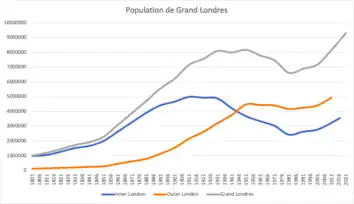 La population du Grand Londres d'aujourd'hui s’élevait à 1,1 million d'habitants en 1801 : 850 000 personnes vivaient dans la zone urbaine de Londres, alors que 250 000 personnes vivaient dans des villes et villages qui ne faisaient pas encore partie de la métropole. La population a augmenté jusqu'à 8,6 millions de personnes en 1939, puis baissé à 6,8 millions vers 1980 avant d'augmenter à nouveau au début des années 1980. La population de 2011 est équivalente à celle de 1951. Évolution de la population d'Inner London, Outer London et du Grand Londres de 1801 à 2011 :