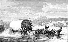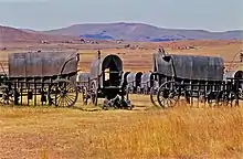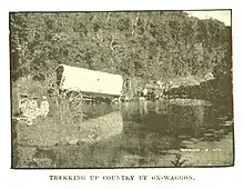 Les Voortrekkers voyagent à bord de chariots bâchés à double toit[12] de 4 m de long environ, de 1 m de large et au plancher situé à 1,7 m de hauteur sert de maison pour la mère et les enfants boers. Les 2 roues arrière du chariot sont plus grandes que les deux roues avant. Tous les ingrédients et l'équipement nécessaire pour la plupart des plats, ainsi que les meubles et les affaires personnels (draps) sont entassés dans le chariot. La Bible et les livres de cantiques, les vêtements, la vaisselle et les ustensiles de cuisine sont emballés dans les bancs situés à l'avant et à l'arrière du chariot. En dessous, sous le plancher, les outils tels que le sabot de frein, le cric, la fosse à goudron et les barils d'eau sont suspendus. L'ensemble du chariot est construit en planches ajustées, facilement démontables[12]. Enfin, ces chariots sont tirés par équipages de 12 à 16 chevaux du Cap ou par 4 à 8 paires de bœufs[12], plus résistants. La plupart des familles voortrekkers disposent d'un ou 2 chariot, bien que les plus riches en possède jusqu'à huit. En terrain plat, l'attelage peut ainsi parcourir 20 à 30 km par jour en 7 à 9 heures de routes[12].