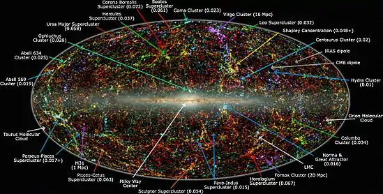Cette masse est observable indirectement par son effet sur le mouvement de galaxies et de leurs amas sur une région large de plusieurs centaines de millions d'années-lumière, jusqu'au superamas de la Vierge. Le Grand Attracteur se déplace en direction du superamas de Shapley[1].