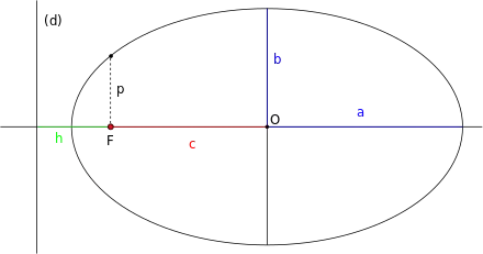 La longueur du demi-grand axe et celle du demi-petit axe sont liées par l'excentricité et le « paramètre » de l’ellipse, généralement noté p, représentant le demi latus rectum (corde parallèle à la directrice et passant par le foyer) :