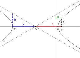 L'hyperbole est une conique d'excentricité linaire supérieure à 1. L'axe transverse d'une hyperbole, segment de la droite qui traverse le centre et les deux foyers de l'hyperbole, est l'équivalent du demi-grand axe d'une ellipse. L'axe conjugué d'une hyperbole, segment de la droite compris entre l'un des sommets de l'hyperbole et l'une des droites asymptotes à la courbe de même sommet, est l'équivalent au demi-petit axe d'une ellipse.