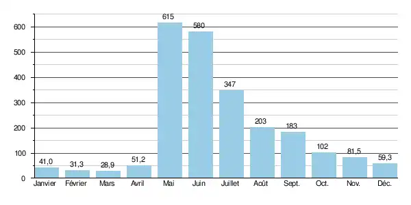 Le débit moyen mensuel observé en mars (minimum d'étiage) est de 28,9 m3/s, soit plus ou moins 4,5 % du débit moyen du mois de mai (615 m3/s), ce qui témoigne de l'importante amplitude des variations saisonnières. Sur la durée d'observation de 10 ans, le débit mensuel minimal a été de 22,2 m3/s (), tandis que le débit mensuel maximal s'élevait à 906 m3/s ().