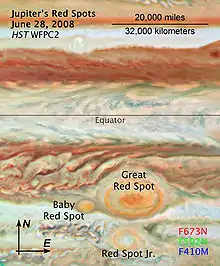 En l'an 2000, une autre tache s'est formée dans l'hémisphère sud, similaire en apparence à la Grande Tache rouge mais plus petite. Elle a été créée par la fusion de plusieurs tempêtes ovales blanches plus petites (observées pour la première fois en 1938). La tache résultante, nommée Oval BA et surnommée Red Spot Junior (« Petite Tache rouge » en anglais), a depuis accru son intensité et est passée du blanc au rouge[28],[29],[30]. Les mêmes mesures infrarouges indiquent que Red Spot Junior s'élève à la même altitude que la Grande Tache rouge et la même hypothèse quant à sa composition est mise en avant[24].