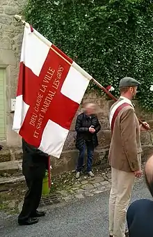Pour les solennités et les funérailles des confrères est arboré le drapeau amarante à croix blanche, portant la devise de Limoges en français d’un côté : « Dieu sauve la ville et saint Martial les gens », en limousin de l’autre côté : « Dieus gart la vila et sent Marsals la gent ».