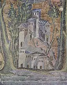 Selon Richard Ettinghausen[15], le thème dominant et nouveau est celui de l'architecture. On trouve ainsi représentés des palais (architectures riches à étage), des maisons, assemblées comme dans un village, et des constructions uniques, un hippodrome, un portail à ciel ouvert. Cette iconographie pacifique (sans fortification) servirait à montrer l'étendue du dar al-islam.