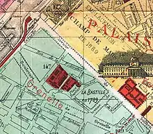 Elle est érigée sur une parcelle du pâté de maisons où, lors de l'Exposition universelle de Paris de 1889, était installée une reconstruction de la Bastille et de son voisinage, avec une cour intérieure couverte d'un plafond bleu décoré de fleurs de lys.