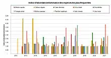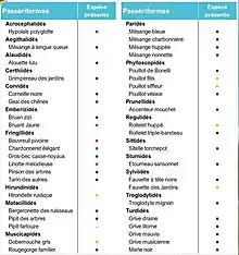 Depuis 2013, 7 points d’écoute ont été réalisés, 2 fois par an, sur le site (1re quinzaine d'avril, 2e quinzaine de mai)[34]. Au total, 68 espèces ont été observées ou entendues[35] dont 34 espèces sont probablement nicheuses sur le site et sa périphérie et sans doute 7 espèces supplémentaires dont il faudrait confirmer le statut de nidification (nicheur possible).