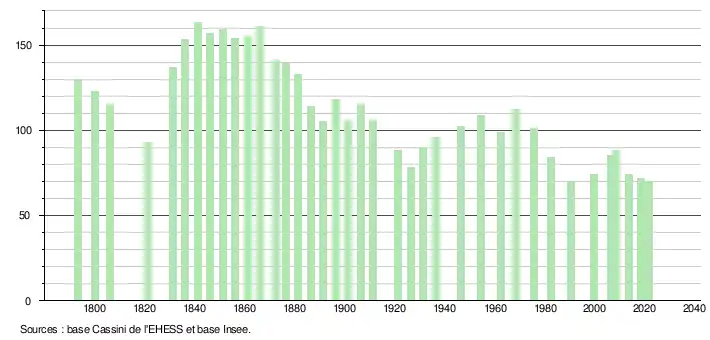 L'évolution du nombre d'habitants est connue à travers les recensements de la population effectués dans la commune depuis 1793. Pour les communes de moins de 10 000 habitants, une enquête de recensement portant sur toute la population est réalisée tous les cinq ans, les populations légales des années intermédiaires étant quant à elles estimées par interpolation ou extrapolation[17]. Pour la commune, le premier recensement exhaustif entrant dans le cadre du nouveau dispositif a été réalisé en 2008[18].