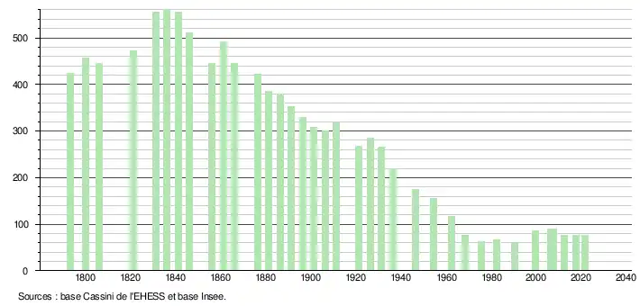 L'évolution du nombre d'habitants est connue à travers les recensements de la population effectués dans la commune depuis 1793. Pour les communes de moins de 10 000 habitants, une enquête de recensement portant sur toute la population est réalisée tous les cinq ans, les populations légales des années intermédiaires étant quant à elles estimées par interpolation ou extrapolation[18]. Pour la commune, le premier recensement exhaustif entrant dans le cadre du nouveau dispositif a été réalisé en 2007[19].