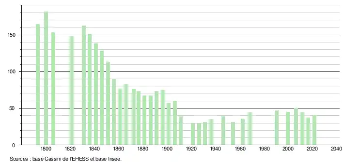 L'évolution du nombre d'habitants est connue à travers les recensements de la population effectués dans la commune depuis 1793. Pour les communes de moins de 10 000 habitants, une enquête de recensement portant sur toute la population est réalisée tous les cinq ans, les populations légales des années intermédiaires étant quant à elles estimées par interpolation ou extrapolation[15]. Pour la commune, le premier recensement exhaustif entrant dans le cadre du nouveau dispositif a été réalisé en 2006[16].