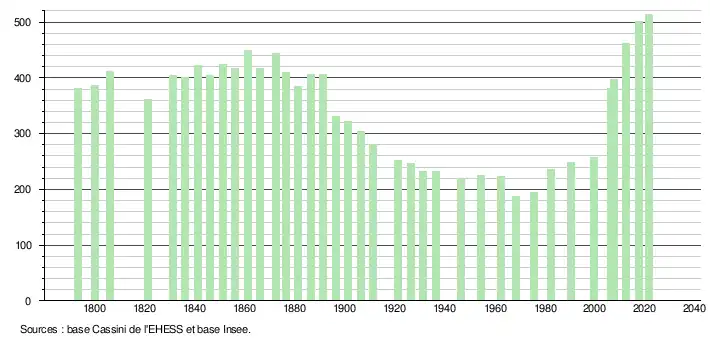 L'évolution du nombre d'habitants est connue à travers les recensements de la population effectués dans la commune depuis 1793. Pour les communes de moins de 10 000 habitants, une enquête de recensement portant sur toute la population est réalisée tous les cinq ans, les populations légales des années intermédiaires étant quant à elles estimées par interpolation ou extrapolation[23]. Pour la commune, le premier recensement exhaustif entrant dans le cadre du nouveau dispositif a été réalisé en 2007[24].