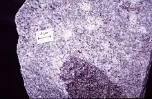 Le granite est une roche plutonique à texture grenue, riche en quartz, qui comporte plus de feldspath alcalin que de plagioclase. Il est caractérisé par sa constitution en minéraux : quartz, feldspaths potassiques (orthoses) et plagioclases, micas (biotite ou muscovite). Le granite et ses roches associées forment l'essentiel de la croûte continentale de la planète[1]. C'est un matériau résistant très utilisé en construction, dallage, décoration, sculpture, sous l'appellation granit.