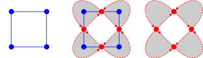 - Comme le graphe médial est associé à un plongement particulier du graphe G, deux plongements différents peuvent donner naissance à des graphes médiaux non isomorphes. Dans la représentation ci-contre, les deux graphes médiaux rouges ne sont pas isomorphes car les deux sommets à boucles sont reliés par une arête dans l'un, et pas dans l'autre.