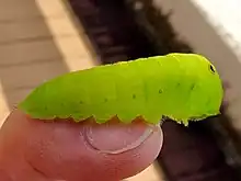 Frederic Moore, cité dans Bingham (1907)[4], la décrit comme suit : « Lisse, épaissie du deuxième au 5e segment et diminuant ensuite jusqu'à la fin; avec deux courtes épines subdorsales charnues sur le 4e segment, entre lesquelles se trouve une ligne transversale jaune pâle, deux épines plus courtes également aux 2e et 3e segment et deux sur le segment anal ; de couleur verte, avec une ligne longitudinale postérieure latérale et inférieure jaunâtre pâle. »