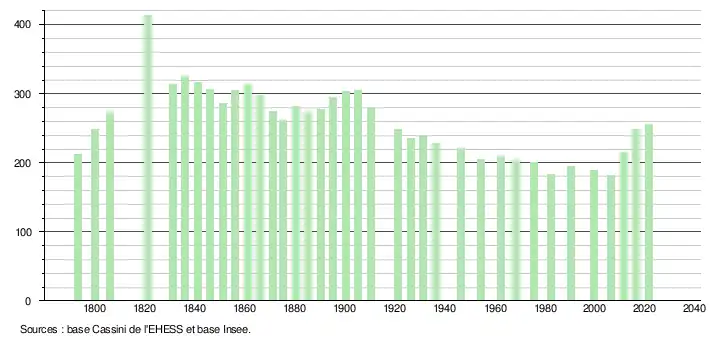 L'évolution du nombre d'habitants est connue à travers les recensements de la population effectués dans la commune depuis 1793. Pour les communes de moins de 10 000 habitants, une enquête de recensement portant sur toute la population est réalisée tous les cinq ans, les populations légales des années intermédiaires étant quant à elles estimées par interpolation ou extrapolation[18]. Pour la commune, le premier recensement exhaustif entrant dans le cadre du nouveau dispositif a été réalisé en 2006[19].