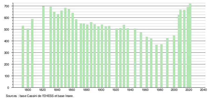 | L'évolution du nombre d'habitants est connue à travers les recensements de la population effectués dans la commune depuis 1793. Pour les communes de moins de 10 000 habitants, une enquête de recensement portant sur toute la population est réalisée tous les cinq ans, les populations légales des années intermédiaires étant quant à elles estimées par interpolation ou extrapolation[27]. Pour la commune, le premier recensement exhaustif entrant dans le cadre du nouveau dispositif a été réalisé en 2008[28]. En 2021, la commune comptait 721 habitants[Note 6], en augmentation de 7,77 % par rapport à 2015 (Haute-Garonne : +7,43 %, France hors Mayotte : +1,84 %). |