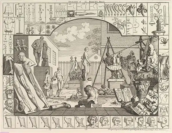- Cette estampe est le portrait-manifeste de son traité sur la Ligne de beauté (L'Analyse de la beauté), ici présent sur la palette[31].