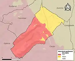 Le retrait-gonflement des sols argileux est susceptible d'engendrer des dommages importants aux bâtiments en cas d’alternance de périodes de sécheresse et de pluie. La totalité de la commune est en aléa moyen ou fort (88,8 % au niveau départemental et 48,5 % au niveau national). Sur les 262 bâtiments dénombrés sur la commune en 2019, 262 sont en aléa moyen ou fort, soit 100 %, à comparer aux 98 % au niveau départemental et 54 % au niveau national. Une cartographie de l'exposition du territoire national au retrait gonflement des sols argileux est disponible sur le site du BRGM[27],[Carte 3].