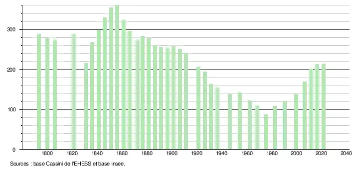 L'évolution du nombre d'habitants est connue à travers les recensements de la population effectués dans la commune depuis 1793. Pour les communes de moins de 10 000 habitants, une enquête de recensement portant sur toute la population est réalisée tous les cinq ans, les populations légales des années intermédiaires étant quant à elles estimées par interpolation ou extrapolation[14]. Pour la commune, le premier recensement exhaustif entrant dans le cadre du nouveau dispositif a été réalisé en 2006[15].