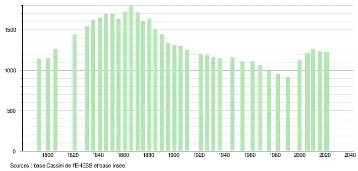 L'évolution du nombre d'habitants est connue à travers les recensements de la population effectués dans la commune depuis 1793. Pour les communes de moins de 10 000 habitants, une enquête de recensement portant sur toute la population est réalisée tous les cinq ans, les populations légales des années intermédiaires étant quant à elles estimées par interpolation ou extrapolation[30]. Pour la commune, le premier recensement exhaustif entrant dans le cadre du nouveau dispositif a été réalisé en 2005[31].