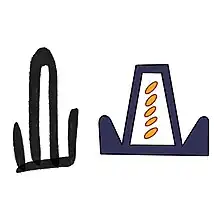 Il représente tas de grains entassés sur un socle à bordure en pisé. Quand l'institution du double Grenier (šnwty) est évoquée dans certaines graphies semi-cursives, deux signes peuvent être rassemblé en un en deux tas de grains sur un seul socle. Il est translittéré šnwt.