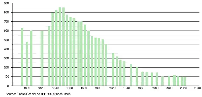 L'évolution du nombre d'habitants est connue à travers les recensements de la population effectués dans la commune depuis 1793. Pour les communes de moins de 10 000 habitants, une enquête de recensement portant sur toute la population est réalisée tous les cinq ans, les populations légales des années intermédiaires étant quant à elles estimées par interpolation ou extrapolation[14]. Pour la commune, le premier recensement exhaustif entrant dans le cadre du nouveau dispositif a été réalisé en 2007[15].