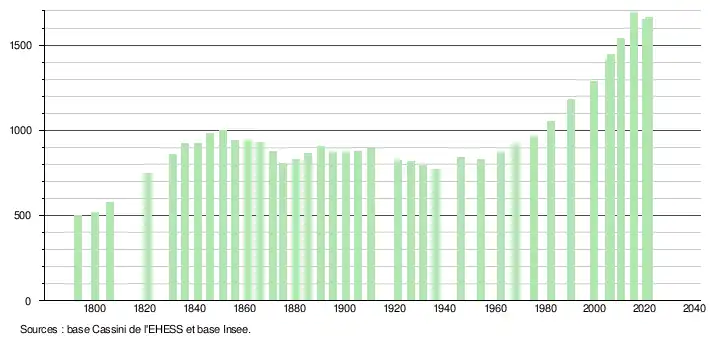 L'évolution du nombre d'habitants est connue à travers les recensements de la population effectués dans la commune depuis 1793. Pour les communes de moins de 10 000 habitants, une enquête de recensement portant sur toute la population est réalisée tous les cinq ans, les populations légales des années intermédiaires étant quant à elles estimées par interpolation ou extrapolation[24]. Pour la commune, le premier recensement exhaustif entrant dans le cadre du nouveau dispositif a été réalisé en 2005[25].