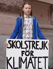 Le , jour de sa rentrée en neuvième année (équivalent de la classe de troisième du système français) dans une école de Stockholm, Greta Thunberg entame une grève devant le Riksdag (Parlement suédois), et explique aux journalistes conviés qu'elle n'ira pas à l'école jusqu'aux élections générales du [22],[23]. La Suède venait alors de vivre une canicule avec des feux de forêt sans précédent. Elle exige que le gouvernement suédois réduise les émissions de dioxyde de carbone d'origine anthropique, comme prévu par l'accord de Paris. Elle reste assise devant le Parlement suédois chaque jour durant les heures d'école. Elle appelle, sur sa pancarte, à une « grève de l'école pour le climat »[3]. Son histoire est reprise par les journaux internationaux.