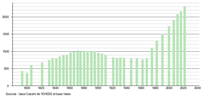 L'évolution du nombre d'habitants est connue à travers les recensements de la population effectués dans la commune depuis 1793. Pour les communes de moins de 10 000 habitants, une enquête de recensement portant sur toute la population est réalisée tous les cinq ans, les populations légales des années intermédiaires étant quant à elles estimées par interpolation ou extrapolation[22]. Pour la commune, le premier recensement exhaustif entrant dans le cadre du nouveau dispositif a été réalisé en 2006[23].
