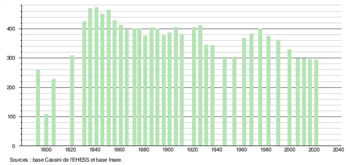 L'évolution du nombre d'habitants est connue à travers les recensements de la population effectués dans la commune depuis 1793. Pour les communes de moins de 10 000 habitants, une enquête de recensement portant sur toute la population est réalisée tous les cinq ans, les populations légales des années intermédiaires étant quant à elles estimées par interpolation ou extrapolation[46]. Pour la commune, le premier recensement exhaustif entrant dans le cadre du nouveau dispositif a été réalisé en 2006[47].