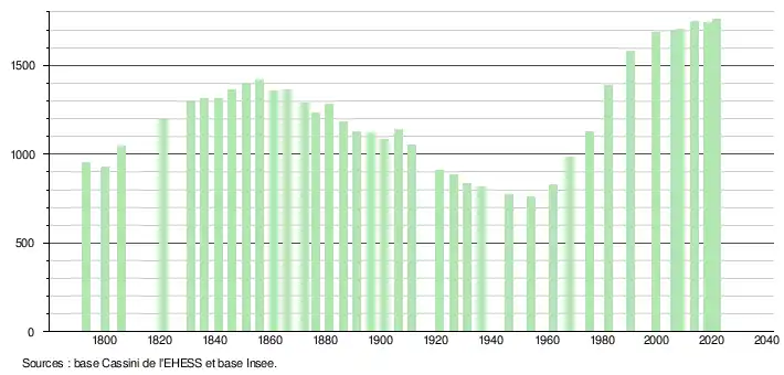 L'évolution du nombre d'habitants est connue à travers les recensements de la population effectués dans la commune depuis 1793. Pour les communes de moins de 10 000 habitants, une enquête de recensement portant sur toute la population est réalisée tous les cinq ans, les populations légales des années intermédiaires étant quant à elles estimées par interpolation ou extrapolation[25]. Pour la commune, le premier recensement exhaustif entrant dans le cadre du nouveau dispositif a été réalisé en 2008[26].