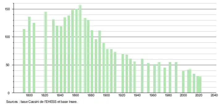 L'évolution du nombre d'habitants est connue à travers les recensements de la population effectués dans la commune depuis 1793. Pour les communes de moins de 10 000 habitants, une enquête de recensement portant sur toute la population est réalisée tous les cinq ans, les populations légales des années intermédiaires étant quant à elles estimées par interpolation ou extrapolation[30]. Pour la commune, le premier recensement exhaustif entrant dans le cadre du nouveau dispositif a été réalisé en 2008[31].