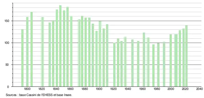 L'évolution du nombre d'habitants est connue à travers les recensements de la population effectués dans la commune depuis 1793. Pour les communes de moins de 10 000 habitants, une enquête de recensement portant sur toute la population est réalisée tous les cinq ans, les populations légales des années intermédiaires étant quant à elles estimées par interpolation ou extrapolation[25]. Pour la commune, le premier recensement exhaustif entrant dans le cadre du nouveau dispositif a été réalisé en 2007[26].