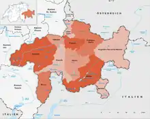 Les communes y sont libres de spécifier leurs propres langues officielles. Le romanche régresse face à l'allemand[39]. L'allemand connaît également une expansion dans les parties orientales des Grisons italiens, non contiguës au canton du Tessin.
