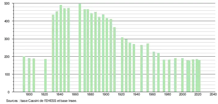 L'évolution du nombre d'habitants est connue à travers les recensements de la population effectués dans la commune depuis 1793. Pour les communes de moins de 10 000 habitants, une enquête de recensement portant sur toute la population est réalisée tous les cinq ans, les populations légales des années intermédiaires étant quant à elles estimées par interpolation ou extrapolation[17]. Pour la commune, le premier recensement exhaustif entrant dans le cadre du nouveau dispositif a été réalisé en 2008[18].