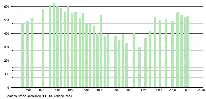 L'évolution du nombre d'habitants est connue à travers les recensements de la population effectués dans la commune depuis 1793. Pour les communes de moins de 10 000 habitants, une enquête de recensement portant sur toute la population est réalisée tous les cinq ans, les populations légales des années intermédiaires étant quant à elles estimées par interpolation ou extrapolation[23]. Pour la commune, le premier recensement exhaustif entrant dans le cadre du nouveau dispositif a été réalisé en 2007[24].