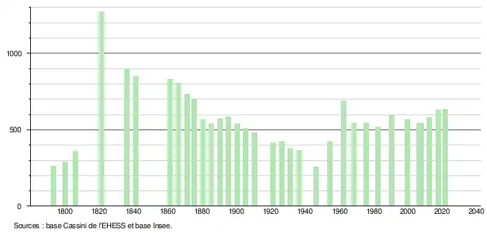 L'évolution du nombre d'habitants est connue à travers les recensements de la population effectués dans la commune depuis 1793. Pour les communes de moins de 10 000 habitants, une enquête de recensement portant sur toute la population est réalisée tous les cinq ans, les populations légales des années intermédiaires étant quant à elles estimées par interpolation ou extrapolation[24]. Pour la commune, le premier recensement exhaustif entrant dans le cadre du nouveau dispositif a été réalisé en 2007[25].