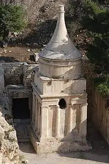 L'entrée de la tombe (à gauche de la photo) derrière le monument d'Absalom.