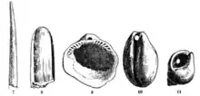 Une autre petite pointe de sagaie (image ci-dessous, no 6) a une extrémité très aiguë ; elle est rainurée sur sa face antérieure. Sa base en biseau simple, ou bec de flûte, correspond à un biseau inverse de la hampe et assure un emmanchement très solide de la partie efficiente de l'arme[13].