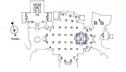 Légende du plan : A. Shiva au Mont Kailash ; B. Shiva Lakulisha, yogin[5] ; C. Shiva Nataraja, dansant ; D. victoire de Shiva sur Andhaka ; E. le mariage de Shiva ; F. Shiva Gangadhara, la descente du Gange ; G. Mahadeva Trimurti « Shiva sous trois de ses cinq aspects » ; H. Shiva Ardhanari « à demi féminin » ; I. Shiva et un démon, Andhaka ou Ravana (le jeu de dé) ; J et K autel du Shiva Linga ; L. réservoir d'eau.