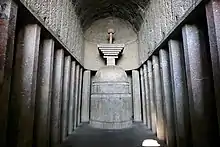 Vue générale, avec le haut des colonnes d'entrée du chaitya visible, et le petit stupa extérieur