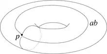 À partir de ce point, on peut construire des lacets, i.e des courbes fermées, qui partent du point p, « se promènent » sur le tore et qui reviennent au point de départ. Imaginons que les lacets soient faits à partir de caoutchouc comme un élastique et qu'il soit ainsi possible de les étirer, les déformer de telle manière que le point de départ et le point d'arrivée soient toujours p et que les lacets se déplacent toujours sur le tore. Une telle déformation s'appelle une homotopie : on dit que deux lacets qui peuvent s'obtenir l'un à partir de l'autre par une homotopie sont homotopiquement équivalents. Ce sont les lacets à déformation près qui nous intéressent : on regroupe donc les lacets dans des classes d'homotopie. Le groupe fondamental du tore est l'ensemble des différentes classes d'homotopie des lacets.