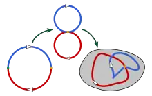 On souhaite donner une structure de groupe à cet ensemble π1(X, p). Si f et g sont deux lacets de X (basés en p), leur juxtaposition[7],[8] ou composition[9] est le lacet h appelé lacet composé[10] de f et de g ou lacet produit[11] fg, défini par :